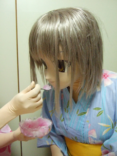 | 9月9日。 残暑厳しい晴れの良き日。 しおりさんと一緒にカキ氷を作りましたー。 (写真はクリックで別窓表示します) さぁっ! 浴衣に着替えて雰囲気も出ました。 これで準備万端! さっそく作りましょー。 まずは氷をターンテーブルに乗る大きさに切断しますー。 シャコシャコシャコ……。 な、、、なかなか切れませんね? シャコシャコシャコシャコ。 シャコシャコ……。 切れたー! じゃじゃーん。 氷削機「HATUYUKI」の登場ー!! 氷をセットして準備OK!! うーん。よいしょ! うぐぐぐぅ。 ゴリゴリゴリ。 あ、落ちてきました。 パサッ、パサッ。 ゴリゴリゴリ。 パサパサ。 ゴリゴリ。 パサパサ。 できたー。 しおりさん、胸元がはだけて色っぽくなっておりますー。(*´Д`) イチゴシロップをかけますー。 たっぷりたっぷり。 いただきまーすっ! はい、あ〜ん。 しおりさん、あ〜ん。 シャクシャクシャク……。 キーーーーンッ! ふおぉ! 頭がーっ、頭がーーーっ!! |
